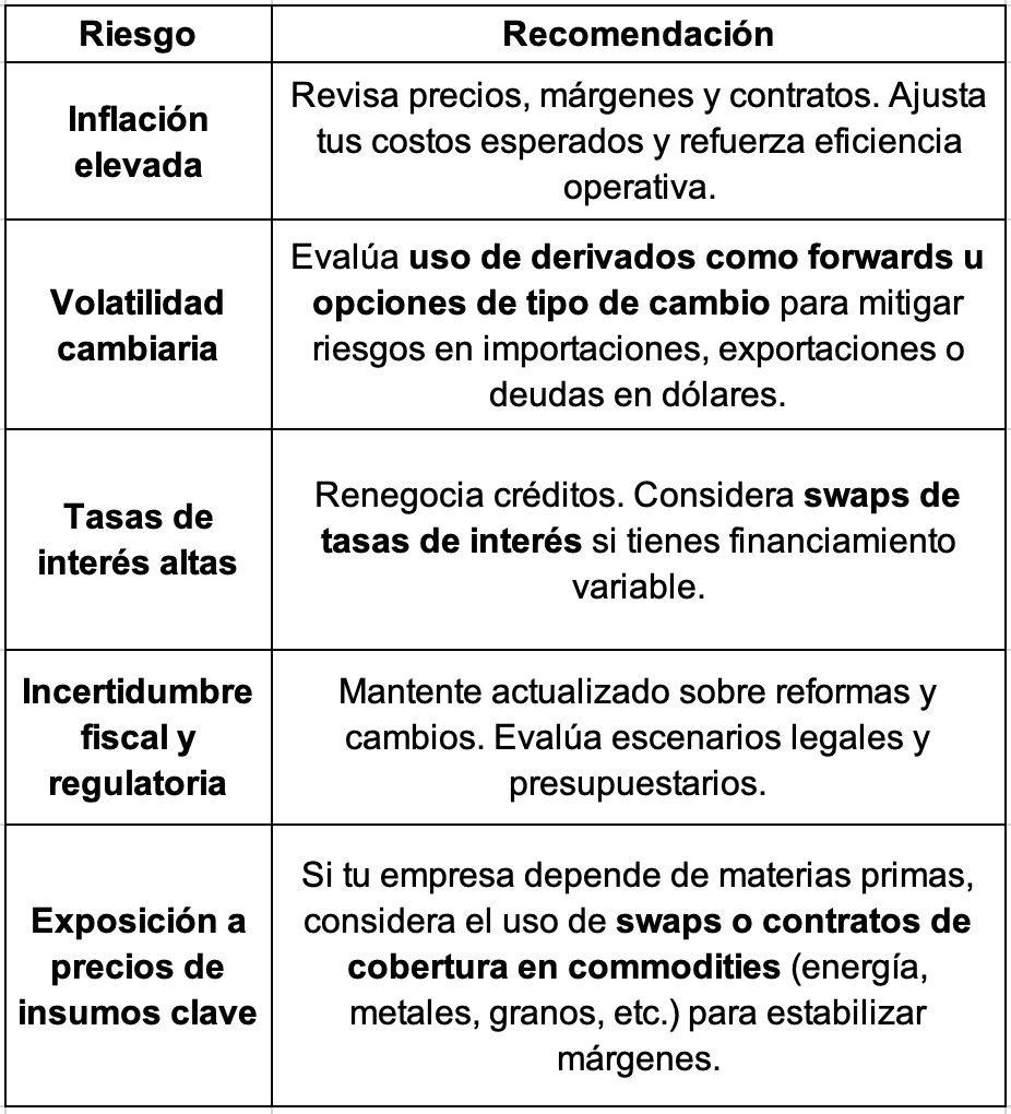 El 2025 ha dejado claro que anticiparse vale más que reaccionar, el panorama económico que vive México exige más cautela financiera, visión estratégica y estar preparados ante posibles escenarios complicados. Las empresas que actúen con información y de forma proactiva tendrán mejores oportunidades para sortear los retos y aprovechar lo que venga. Hoy más que nunca, estar protegido con coberturas y derivados puede marcar la diferencia entre resistir un choque o quedar expuesto. Para una asesoría sin costo, contáctanos en admin@gvservices.com.mx o por WhatsApp al +52 55 2690 5302.